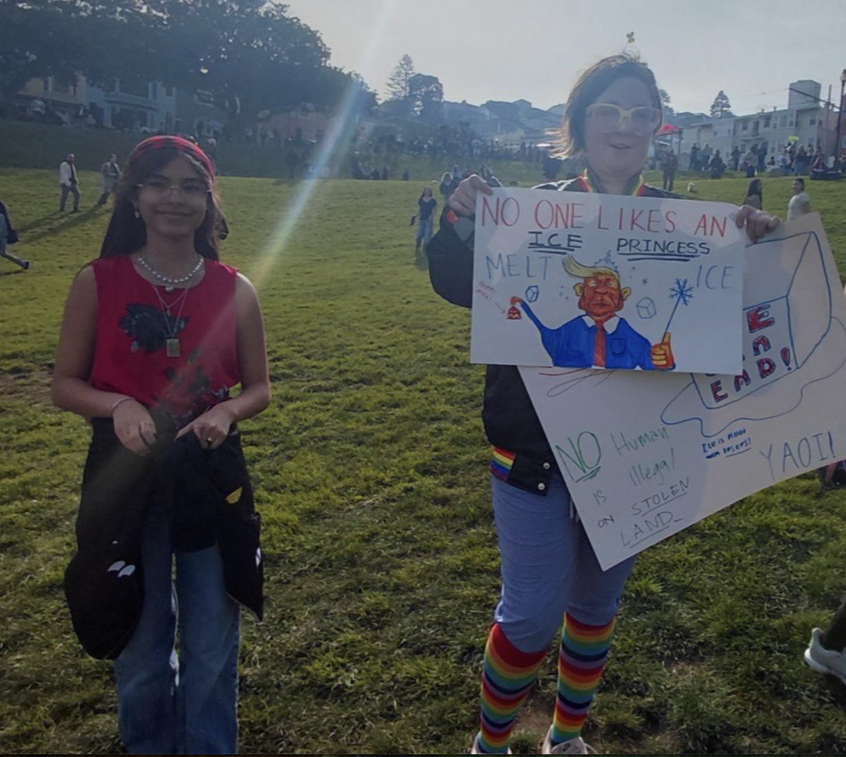 Alex Pretti’s death enraged the nation, proving a crucial tipping point when it comes to anti-ICE sentiment. Organizations began to call for a shutdown on Friday in order to prove to the government that the people stood against ICE, and supported all the people suffering daily in Minneapolis and cities around the country. These organizations called for “no school, no work, and no shopping,” and drew in a remarkable amount of participants. In San Francisco, many people who abstained from work or school gathered at Dolores Park to protest. By 2:00 PM, the park was enshrouded in a sea of people calling for change, fists raised toward the sky. This massive crowd consisted largely of high school students, who had established organized “walk-out” times and locations, and were among the loudest fighters for justice at the park. Signs waved, from the humorous (“the only ICE we want is on our wrists”) to the uplifting (“love wins over hate”) to the grim yet serious (“our country is run by murderers”).